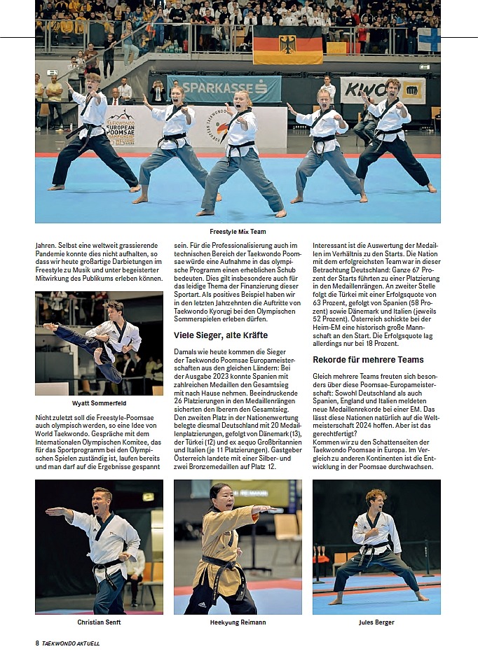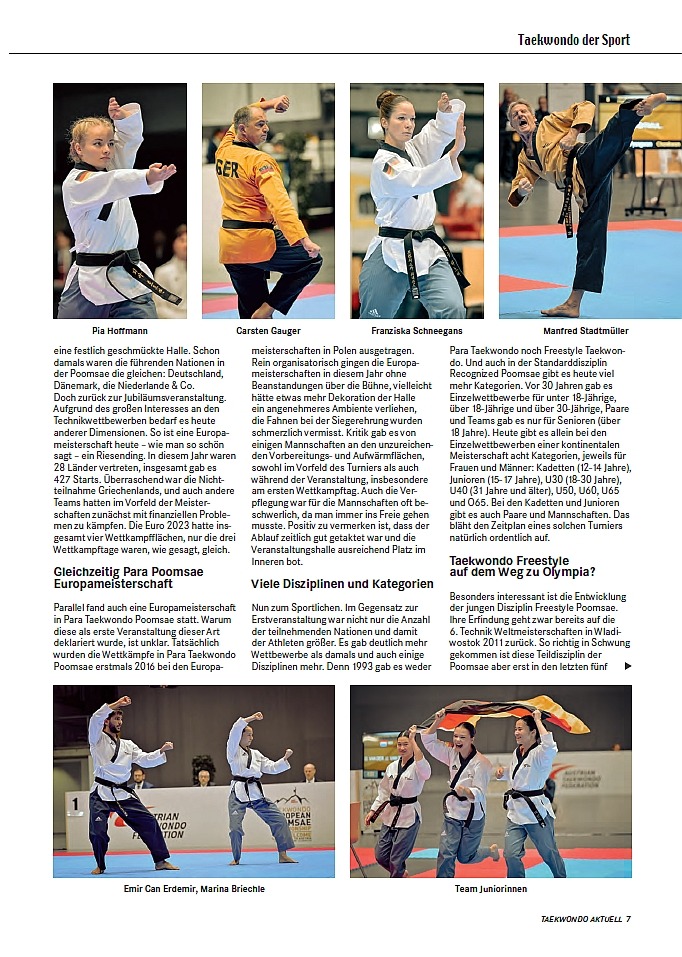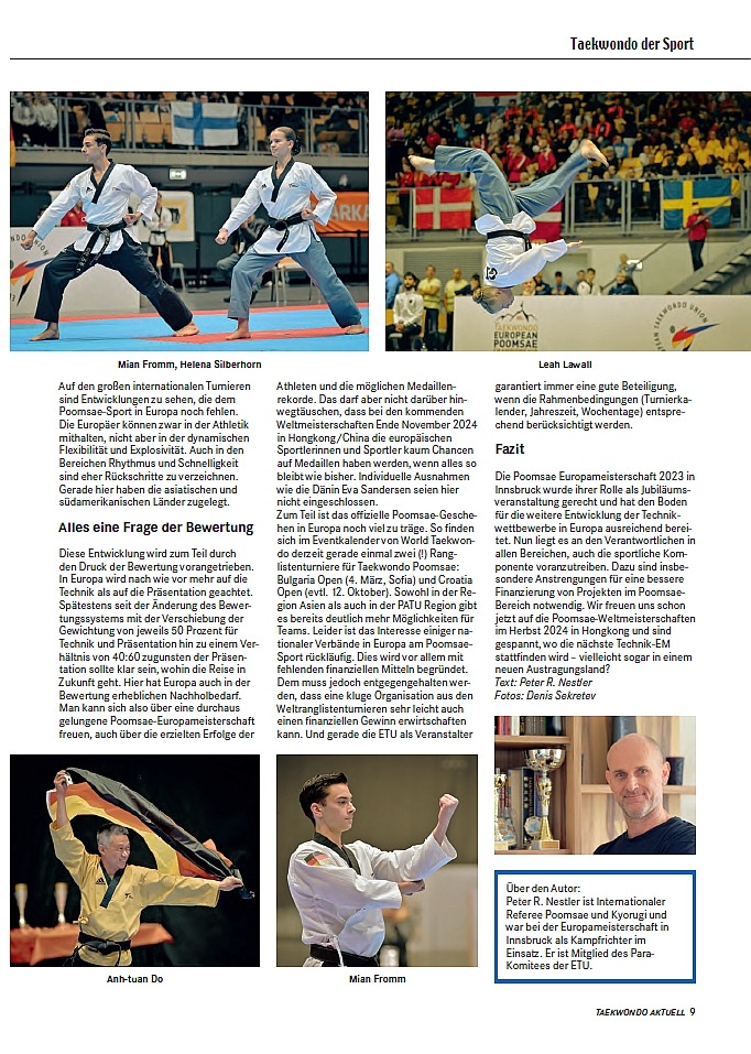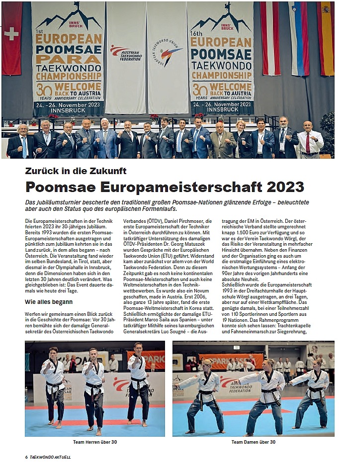 Im Jahr 2023 feierten die Poomsae-Europameisterschaften ihr 30-Jahr-Jubiläum. Zum zweiten Mal fanden die European Taekwondo Poomsae Championships (G4) in Österreich statt. Einen Bericht über die 16. Europameisterschaft im Formenlauf am 24. bis 26. November 2023 in Innsbruck brachte TAEKWONDO AKTUELL in der 1. Ausgabe 2024 im Januar – Autor ist der Poomsae-Experte Peter Nestler, der selbst wieder als International Referee bei der Poomsae-Euro dabei war.